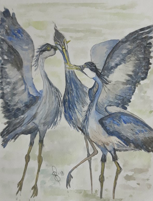 Posted: August 27, 2018 Filed under: #WorldWatercolorGroup, Just for fun, Paintings of Birds, QoR watercolor, Shuswap Lake, Strathmore Paper, Susan Feniak water color and ink, Uncategorized, water color and ink | Tags: #paintingsofbirds, #WorldWatercolorGroup, For the joy of it, Paintings of birds, QOR water color, QoR watercolor, Strathmore Watercolor Paper, Susan Feniak watercolor and ink 7 CommentsHeron Gathering Artist Susan Feniak. Watercolor and ink on Strathmore paper. I don’t recall ever seeing a gathering of Great Blue Herons. The ones we see are loners. One has to assume they gather somewhere and sometime or there wouldn’t be anymore blue herons. Thinking out loud. Have a good week everyone.