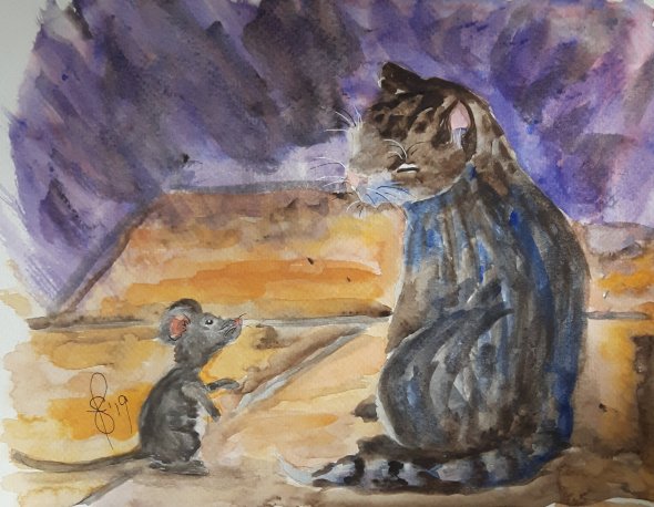 Posted: April 15, 2019 Filed under: #WorldWatercolorGroup, Daniel Smith Extra Fine Watercolors, Daniel Smith watercolours, Fabriano cold press paper, Opus Art Supplies, Paintings of cats, Susan Feniak water color and ink, Uncategorized, Whimsy | Tags: #doodlewash, #WorldWatercolorGroup, Daniel Smith Extra Fine Watercolors, Daniel Smith watercolours, Fabriano papers, Just because, Opus Art Supplies, Paintings of cats, Quick art, sketch book, Susan Feniak watercolor and ink, Susan Feniak watercolors, watercolor and ink, Whimsy 11 CommentsThis one was an experiment. I took a cue from an older Watercolor Artist magazine. Playing with looser brush strokes and different colors. The article was about painting a cat and techniques for painting fur. I couldn’t leave well enough alone and added a mouse. I named my version “Cat and Mouse Game”. Artist Susan Feniak. Daniel Smith watercolor and ink on Fabriano paper.