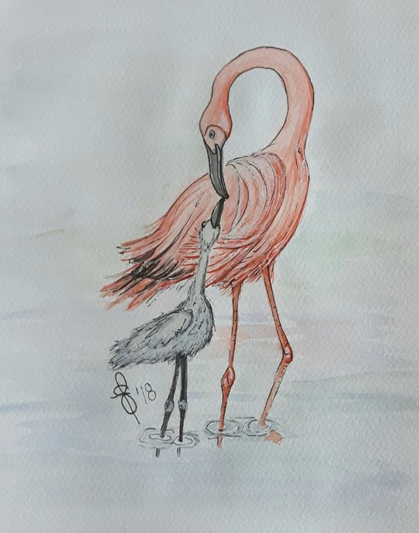 Flamingo Love. Or Mother love? Did you know baby flamingos are white? Artist Susan Feniak. Windsor Newton Cotman Watercolors on Strathmore paper. I have time for art most days. Yay! I just don’t have internet or time to post what I create. Fall will most likely be catch up time for me. Especially here on WP.