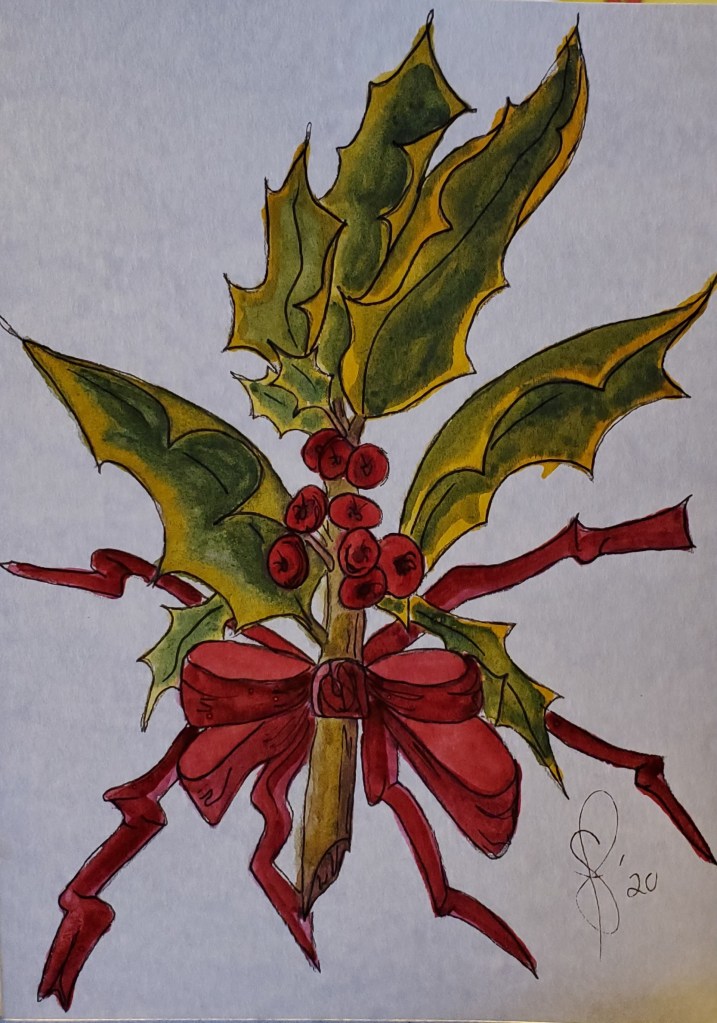 And so it begins, my Christmas card assembly line. Here is a sampling of what I have gotten done to date. Every card is different and they are all original watercolor and ink. 4″ x 6″