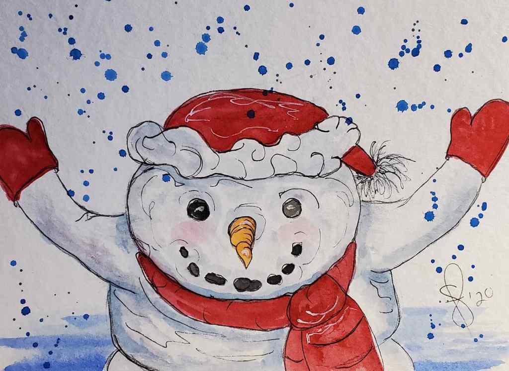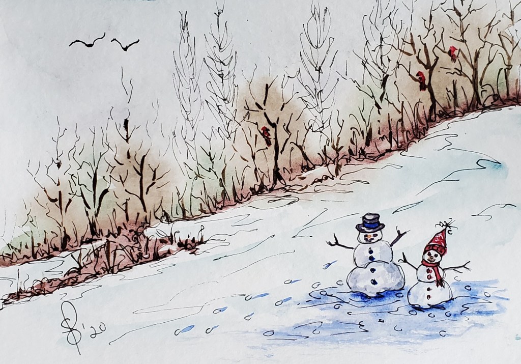 A couple of happy snowmen cards to warm us up and remind you that Christmas is coming! Artist Susan Feniak. Watercolor and ink on Strathmore card stock.